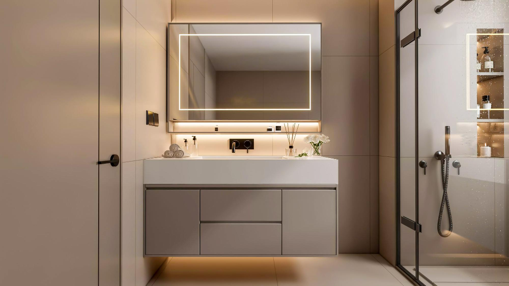 Install high floor-to-ceiling cabinets, floating vanities, and intelligent storage systems such as pull-out drawers and corner shelves. This makes the space tidy and clean.